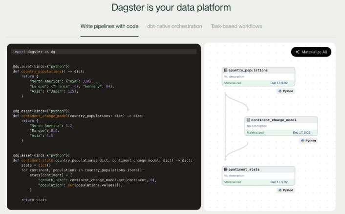 The motivation driving the creation of Dagster stems from a genuine desire to cater to the specific needs of businesses. For some time, business owners have sought a comprehensive solution to gain a bird's-eye view of their company's progress through Dagster. Ship data pipelines quickly and confidently with the modern data orchestrator built for data engineers building data platforms.. This powerful tool equips data engineers with real-time insights, enabling them to expertly guide data towards successful production phases. Below you will find some screenshots of the MVP in action.